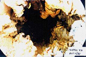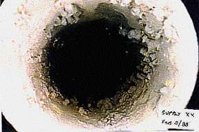 As of March, 1988 the section of pipe being monitored had been opened up to almost its full diameter with only spotted sections of scale and over 90% of the sludge and scale removed. Replacement of the piping was not necessary. Efficiency and operation improved dramatically. |